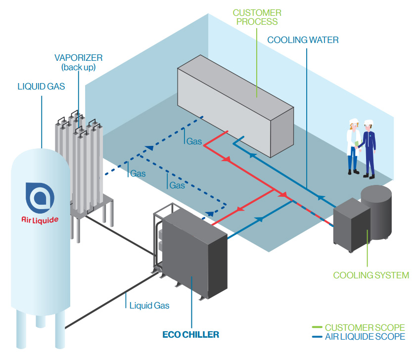 Systemet fungerar genom att återföra den kyla som genereras av förångningen av den flytande gasen tillbaka till ditt kylsystem. Det ansluts enkelt till ditt kylvattensystem och avlastar därmed ditt kylsystem och minskar energibehovet för systemet. ECO CHILLER är bäst lämpad för förbrukning av flytande gas från 50 m3/h och uppåt.