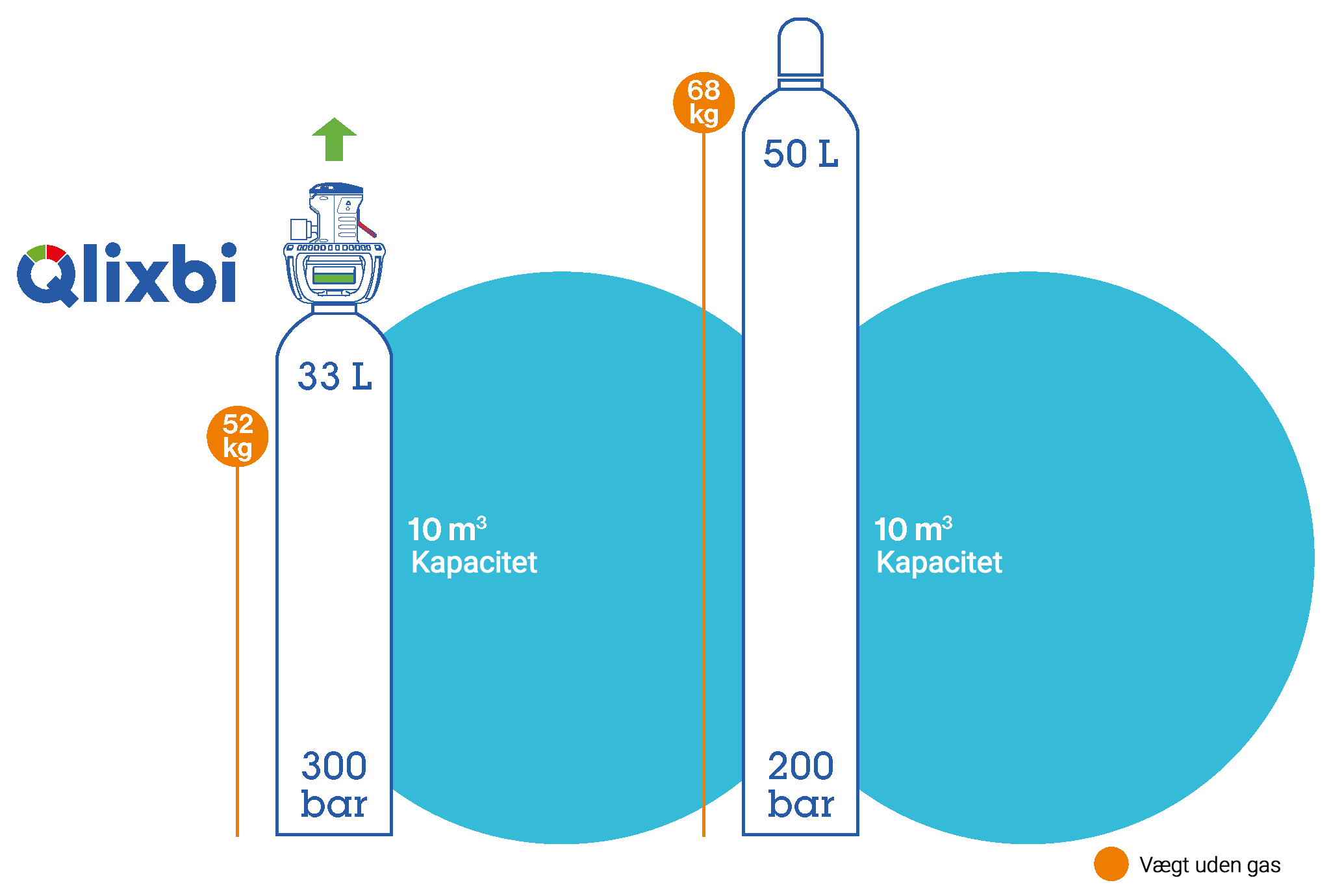 Vi vil afgjort anbefale Qlixbi i 33-liters flasken med 300 bar. Den kompakte flaske inklusive Qlixbi-connectoren vejer kun 52 kg.